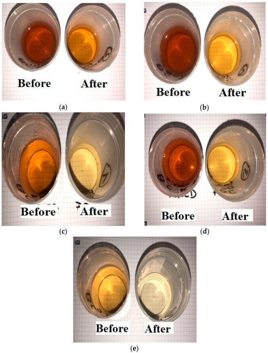 Colors of LLCH at (a) 100%; (b) 80%; (c) 60%; (d) 40%; (e) 20%. LLCH dilutions before and after the adsorption process.