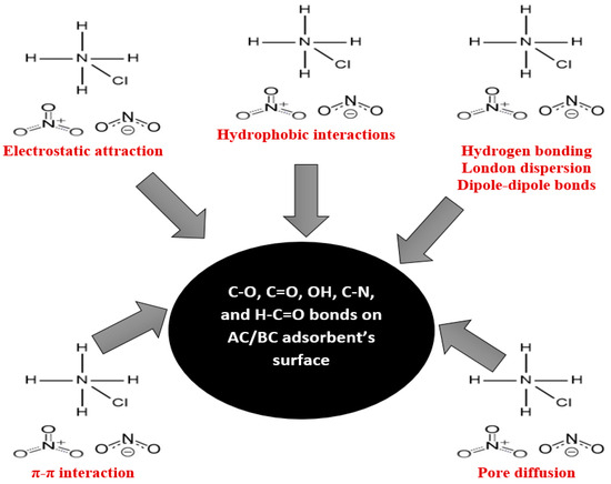 In addition, the adsorption of nitrogen from ammonium chloride onto AC is further influenced by hydrophobic interactions including London dispersion (ACs are hydrophobic in nature and have a C=C double bond and C–O [93]). The unsaturated carbon–carbon double bonds (π bonds) contribute to π–π electron interactions [94]. Oxygen atoms in C–O groups can also participate in hydrogen bonding with polar groups [92] in ammonium chloride. The oxygen atom in the OH group can act as a hydrogen bond acceptor [95]. Figure 9 provides a visual summary of these complex molecular interactions.