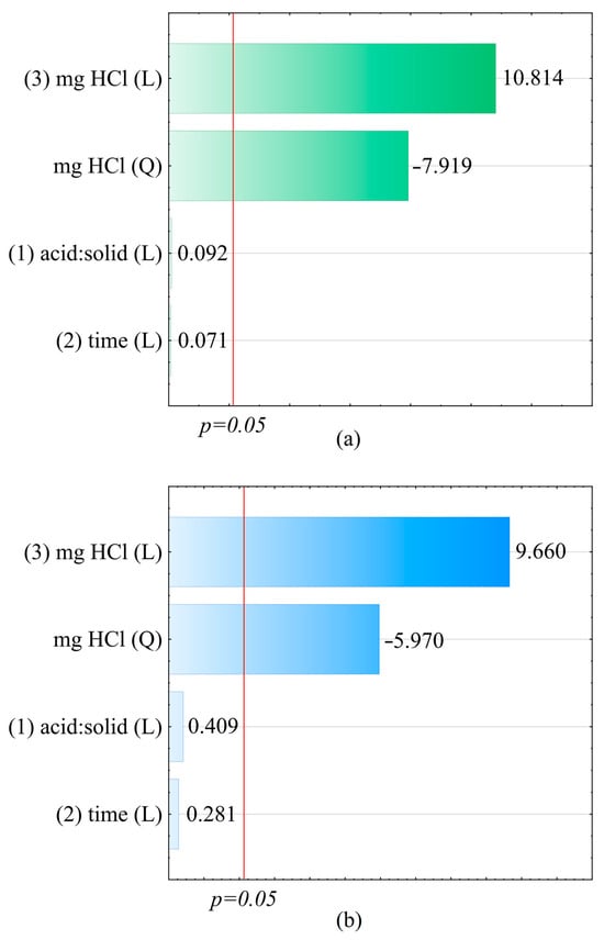 Pareto charts—absolute standardised assessment values for the effects (mg HCl (L), mg HCl (Q), acid:solid (L), and time (L)) for (a) Ce3+ and (b) total P.