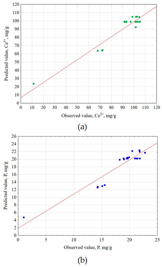 Predicted values vs. observed values for (a) Ce3+ (R2 = 0.923, R2adj = 0.902) and (b) total P (R2 = 0.896, R2adj = 0.868) extraction experiments.