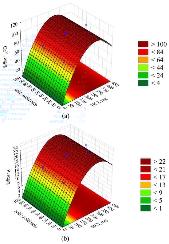 Improving the fit (R2 and R2adj) of both extraction models described would probably be possible by deriving a higher-order equation. This would require taking into account higher-order effects (e.g., cubic effects) [48], which would probably allow for flattening the response surfaces presented in Figure 4 for the mass of HCl used above 300 mg and obtaining the predicted concentrations of Ce and P at a similar level to the measured values. The model, including quadratic effects, causes the surface to curve downward, suggesting a decrease in Ce and P recovery, which deviates from the measured values. As a result of the conducted analysis, it was concluded that the parameter with the greatest influence on the Ce and P extraction efficiency (p < 0.05) is the mass of the HCl applied in the process, and a limit value was defined, above which the leaching of cerium and phosphorus is the greatest. From a statistical perspective, the process efficiency was not significantly dependent on the volume ratio of the reaction solution to the mass of the sludge, but the ratio could significantly influence processes at an industrial scale, such as the pumping of the reaction mixture or its transport via pipelines, due to, e.g., the density of the mixture, the resistance of flow, etc. The process duration had no significant influence on the degree of cerium and phosphorus leaching. The high degree of extraction of cerium and phosphorus makes the obtained solution a perfect raw material for the recovery of these elements.