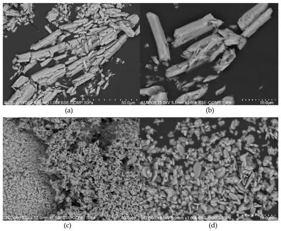 SEM images obtained for Ce2(SO4)3 at a magnification of ×1000 (a) and a magnification of ×3000 (b), and for Ce(SO4)2 at a magnification of ×1500 (c) and a magnification of ×3000 (d).