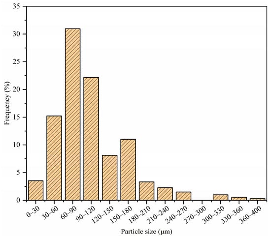Microcapsules encapsulating ZS-1 bitumen rejuvenator were fabricated using UF as the shell material through the ISP method. The preparation process of UFM, illustrated in Figure 1, involves three steps: synthesis of UF resin prepolymer, emulsification of the core material, and synthesis of the microcapsules. For a more detailed description of the process, refer to a previous study []. Figure 2 depicts the particle size distribution of UFMs. The average particle size of UFMs is 100.50 µm, with the majority of particle sizes concentrated in the 60–120 µm range.