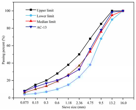 In this study, the AC-13 bituminous mixture was chosen, with its aggregate gradation displayed in Figure 3. The coarse aggregates, fine aggregates, and mineral powder were derived from basalt, limestone, and limestone mineral, respectively. The properties of these aggregates are detailed in Table 1, Table 2 and Table 3. The PG 58-16 matrix bitumen was chosen, and its properties are delineated in Table 4. For the preparation of self-healing bitumen, matrix bitumen was placed in a container, heated to 130–150 °C, followed by the incorporation of 3 wt% UFMs, and then the mixture was stirred at 800–1000 rpm for 15 min. The properties of the self-healing bitumen are presented in Table 4. The optimal bitumen content was determined to be 5.0% through the Marshall mix proportion design. Subsequently, prismatic, cylindrical, and compacted slab specimens of the bituminous mixture, both with and without capsules, were fabricated. The procedure began by heating the aggregate to approximately 163 °C and the bitumen to 150 °C. Following this, the specimens were compacted within a temperature range of 120–150 °C. For cylindrical specimens, compaction was achieved using the Marshall compactor, with each side receiving 75 blows (50 for immersion Marshall test specimens). Meanwhile, the compacted plate specimens were formed using the wheel compactor, typically undergoing around 24 compaction passes.