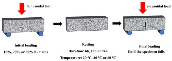 The fatigue–healing–fatigue test process encompassed three stages: initial loading, resting, and final loading. The loading mode was the same as the three-point bending fatigue test, with a stress ratio of 0.2. The self-healing property of various specimens was assessed based on the healing rate (P), as delineated in Equation (1) []. To investigate the factors influencing self-healing, the healing rates of specimens under varying conditions of damage (10%, 20%, and 30%), healing duration (6 h, 12 h, and 24 h), and temperature (20 °C, 40 °C, and 60 °C) were studied. Each test was repeated three times, totaling forty-five prismatic specimens, and the corresponding average was taken as the final result. For a clear description of the test process, a flowchart is plotted in Figure 4.