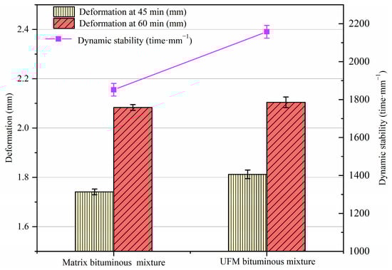 The wheel tracking test was performed on bituminous-mixture slabs to evaluate the high-temperature performance of mixtures containing UFMs, and the results are illustrated in Figure 5. It was seen that the deformation of specimens with UFMs was slightly higher than that of the matrix bituminous mixture at 45 min. This observation could be attributed to a small number of UFMs on the specimen surface breaking during the wheel-running period, with the leaked core material potentially aiding in further compacting the aggregate and reducing the mixture’s internal friction through lubrication, consequently diminishing the surface shear strength []. Fortunately, the deformations of both specimen types were comparable at 60 min, indicating that the UFM maintained good mechanical properties and did not continue breaking. Overall, the dynamic stability of the UFM bituminous mixture specimen is approximately 16.5% higher than that of the matrix bituminous mixture specimen, demonstrating that UFM incorporation enhances the high-temperature anti-rutting performance of the bituminous mixture. This phenomenon could be attributed to the fact that the UFM existed in the form of particles in the bitumen and might act as a reinforcing filler, resulting in a minimal loss of elasticity, which led to an increase in viscosity and the rutting factor of the bitumen []. Simultaneously, some aromatic and saturated components in the bituminous material were absorbed by the UFM, leading to the hardening of the bitumen. These two reasons resulted in an augmented deformation resistance of the bituminous mixture.