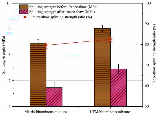 Moisture susceptibility was assessed via the immersed Marshall test and the freeze–thaw splitting test, and the corresponding results are presented in Figure 6 and Figure 7. It can be observed that the MS0 and TSR results demonstrate exceptional consistency; that is, the moisture susceptibility of the bituminous mixture containing UFMs is slightly higher than that of the matrix bituminous mixture. For instance, the MS0 of the UFM bituminous mixture increased by 2.27% compared to that of the matrix bituminous mixture. Possible reasons for this phenomenon include the following: firstly, the rough surface of UFM, as previously mentioned, might create a locking effect with the aggregate, thereby enhancing the adhesion between the bitumen and aggregate []; secondly, the selection of hydrophilic UF as the capsule shell material (due to the capsule core being lipophilic) in this paper, which absorbed some of the infiltrated water, potentially mitigating water damage to the specimen [].