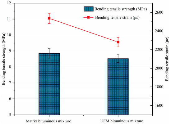 The results of the thermal crack resistance for bituminous mixtures with and without microcapsules are displayed in Figure 8. It can be found that the incorporation of UFMs negatively influences the thermal crack resistance of bituminous mixtures, with decreases in bending tensile strength and strain by 3.7% and 10.1%, respectively. The explanation for these phenomena was that the incorporation of UFMs disrupted the homogeneous structure of the bitumen, reducing its flexibility and ductility. Additionally, the swelling of microcapsule particles led to volume expansion, which tended to produce greater temperature stress, consequently diminishing the thermal crack resistance of the bituminous mixture. However, these results still met the requirements for matrix bituminous mixtures in 1–3, 2–3, 1–4, and 1–4 climatic zonation in China, stipulating that the bending tensile strain should be no less than 2000 με.