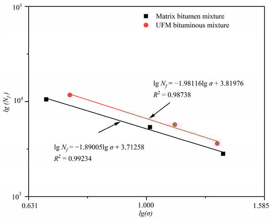 where K and n denote the regression constants related to the material properties and test conditions, respectively. The fatigue regression curves of bituminous mixtures with and without microcapsules are depicted in Figure 9, where the intercept characterizes the anti-fatigue performance, and the slope indicates the sensitivity of the Nf value to the stress level []. It can also be seen from the slope of the fatigue regression curve that the UFM bituminous mixture exhibits better fatigue resistance. Furthermore, observation reveals that the slope of the regression curves for UFM bituminous mixture and matrix bituminous mixture are nearly identical, indicating a similar level of sensitivity to stress levels.