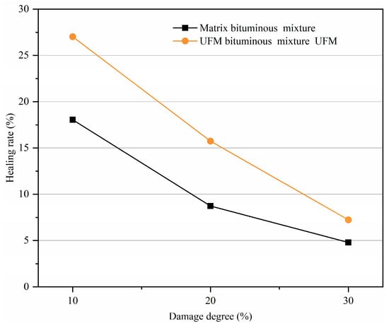 The damage degree is directly correlated with the width and density of the crack and constitutes an important factor influencing the healing rate. In this paper, the damage degree was characterized by the number of initial loading cycles. For instance, with 10% damage, the number of times of initial loading is 10% of the fatigue life when the stress ratio is 0.2, equating to 1050 cycles. Following the initial loading, the specimens were allowed to rest for 24 h at 20 °C, subsequently undergoing final loading until failure. Figure 10 illustrates the variation in the healing rate with damage degree for bituminous mixtures with and without microcapsules. It is notable that the healing rate significantly decreases with an increasing degree of damage, regardless of bituminous mixture type. For example, when the damage level escalates from 10% to 30%, the healing rate of the UFM bituminous mixture drops from 27.02% to 7.23%. This phenomenon could be explained by the critical point of damage in the bitumen mixture specimens. Below this critical point, the material exhibited microcracks and required less self-healing energy, while beyond this point, specimens with high damage levels tended to exhibit large macrocracks, demanding a significant amount of self-healing energy, or in some cases, making self-healing challenging []. Additionally, the healing rate of the UFM bituminous mixture is consistently higher than that of the matrix bituminous mixture at different damage degrees, indicating that the rejuvenator released from the broken microcapsules effectively softened the bitumen and promoted the self-healing of cracks, thereby extending the fatigue life of the specimens.