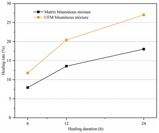 Bitumen exhibits viscoelastic polymeric properties with time–temperature-dependent behavior. In order to investigate the impact of the healing duration on healing rate, specimens with a 10% damage degree were conditioned at 20 °C for 6, 12, and 24 h to rest, followed by the final loading until failure. Figure 11 depicts the variation in healing rate with respect to healing duration for bituminous mixtures with and without microcapsules. It is evident that the healing rate of the mixture increases over time, and upon reaching a healing duration of 12 h, the increasing speed in healing rate decreases. This phenomenon indicates that, following the appearance of cracks, sufficient time was necessary for the specimens to allow for the rejuvenator released from the microcapsules to fill the cracks and facilitated the self-healing of the bituminous mixture. However, beyond a healing duration of 12 h, self-healing was basically completed, and the benefit of prolonging healing duration on the healing rate began to decrease. In addition, it can be found that the healing rate of the UFM bituminous mixture is always higher than that of the matrix bituminous mixture at different healing durations, thus showing the effectiveness of UFM in improving the self-healing property of bituminous mixtures.