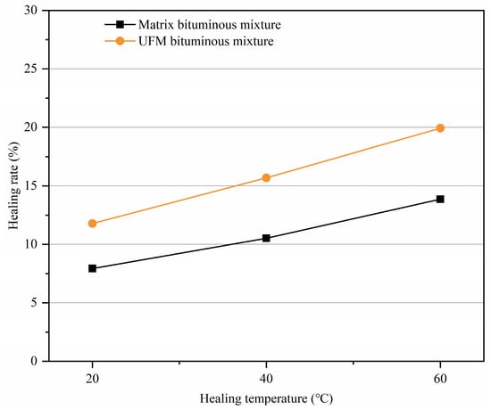 Specimens with 10% damage were subjected to resting periods at 20 °C, 40 °C, and 60 °C for 6 h to investigate the effect of temperature on healing rate. Figure 12 illustrates the variation in healing rate with temperature for bituminous mixtures with and without microcapsules. It is evident that both UFM and matrix bituminous mixtures exhibit a continuous linear increase in the healing rate with increasing temperature, demonstrating the significant impact of temperature on the healing rate. For instance, with the UFM bituminous mixture, as the healing temperature rises from 20 °C to 40 °C and subsequently to 60 °C, the healing rate escalates from 11.78% to 15.69%, and further to 19.92%. The underlying reason for this phenomenon was that the bitumen softened, and its viscosity reduced as the temperature rose in the matrix bituminous mixture, thereby enhancing its self-healing capability. As for UFM bitumen mixture, in addition to this reason, the increase in temperature also increased the diffusion rate of the rejuvenator, allowing it to penetrate the bitumen more quickly []. Furthermore, under different healing times, the healing rate of UFM bituminous mixtures consistently surpassed that of matrix bituminous mixtures, underscoring the efficacy of UFM in enhancing the self-healing property of the bituminous mixture.