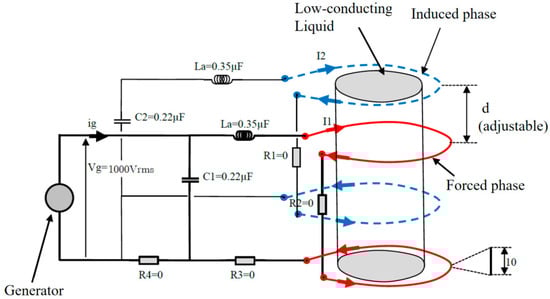 In this study, R. Ernst et al. [3] designed a magnetic traveling field stirring installation. The setup comprises a high-frequency generator, a pair of capacitors, two-phase inductive coils, and cylindrical containers filled with electrolyte. A schematic diagram of this installation is presented in Figure 1.