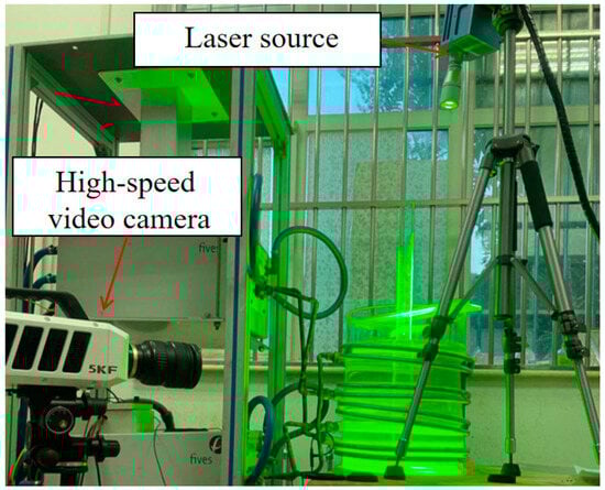 The output parameters of the high-frequency (HF) power supply, including current, voltage, frequency, and power, can be ascertained by reading the display screen on the power supply cabinet. Additionally, the phase difference and amplitude ratio of the currents in the two-phase coils are measured using two Roche coils (CWT mini HF 30R). In this research, a two-dimensional particle image velocimetry (PIV) system was employed to measure the flow field distribution of a liquid within the meridional plane of a cylindrical vessel. To minimize laser shielding by the coil and maximize the field of view, the laser sheet light source (SM-SEM1-10W) was positioned above the vessel. This setup aligned the vertical laser plane with the vessel’s center plane, while a high-speed camera (5KF10) was situated laterally to capture the flow field in this central plane, as illustrated in Figure 2. Hollow glass beads, averaging 50 μm in diameter, served as particle tracers. The high-speed camera recorded at 200 frames per second with an exposure time of 300 μs, producing images with a resolution of 930 × 860 pixels. For image analysis, the open-source Matlab-based software PIVlab (GUI. Version 2.63.0.) was utilized. This involved setting a query window of 32 × 32 pixels to analyze pairs of adjacent images via a mutual correlation algorithm (FFT). The process of filtering, correcting, and smoothing the data led to the derivation of velocity vector fields and velocity intensity gradient cloud maps within the interrogation windows. Post-processing utilizing vector validation and smoothing functions derived the final flow characterization results.