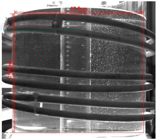 The flow field in the meridional plane of the container, which is primarily influenced by the axial direction of the traveling-wave magnetic field and the Lorentz force, is subjected to a quantitative analysis. To effectively illustrate the driving effect of the high-frequency traveling-wave magnetic field, the flow field within this plane is photographed and examined. At the optimal working point specified in Table 2, the axial center plane’s flow field is captured using a high-speed camera. Due to partial obstruction of the field of view by the coil and optical aberrations from the cylindrical container’s curved edges, the analysis requires cropping areas with excessive aberrations and the laser reflection’s highlighted area at the bottom. Consequently, a rectangular section with dimensions of 27.5 × 25.5 cm in the center plane is selected for flow field analysis, as depicted in Figure 3, with the coil masked out. One limitation of the current study is that the flow field analysis is conducted within a rectangular section of dimensions 27.5 × 25.5 cm, selected to minimize optical aberrations while encompassing a representative area. However, as this section size represents only a subset of the full experimental container, its proportions relative to the overall vessel dimensions may impact the generalizability of the conclusions drawn regarding the flow behavior. While the analyzed region aims to capture characteristic flow patterns, its dimensions could potentially influence the representativeness of the overall flow field. This limitation should be acknowledged. Optimization of the analysis section dimensions and techniques enabling whole-field visualization, such as advanced particle image velocimetry (PIV), may help validate the conclusions by further establishing the translatability of insights beyond the bounds of the measurement area. Dimensional refinement and full-field approaches in future work could strengthen the validity of flow characterization. Hollow glass beads, 50 μm in average diameter, are used as tracer particles in the solution. The camera captures images at 200 frames per second with an exposure time of 300 μs, and these images are processed using PIVlab to analyze and calculate the flow field distribution of the driven liquid.