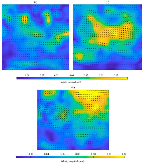 Figure 4 illustrates the flow field of a 30% mass fraction H2SO4 solution in a container, captured 15 s after initiating the high-frequency power supply. As depicted in Figure 4a, upon activation of the power supply, the liquid demonstrates a rapid flow response, transitioning from a state of disordered thermal motion to gradual acceleration under an electromagnetic force. Within 5 s, directional movement tendencies emerge, with the solution’s central part beginning to flow downward. Figure 4b shows that, under an electromagnetic driving force, the solution’s flow rate increases, leading to forced convection. This results in a double-loop flow, where the upper part of the container’s two measured solutions converges towards the center. As driving time progresses, the Joule heat generated near the container wall adjacent to the coil accumulates, raising the temperature and initiating thermal convection. This, combined with forced convection, forms a turbulent vortex, as illustrated in Figure 4c. At this stage, the average flow rate reaches 7.2 cm/s, with a maximum of 13 cm/s, significantly enhancing the solution’s flow under the influence of the high-frequency traveling-wave magnetic field.