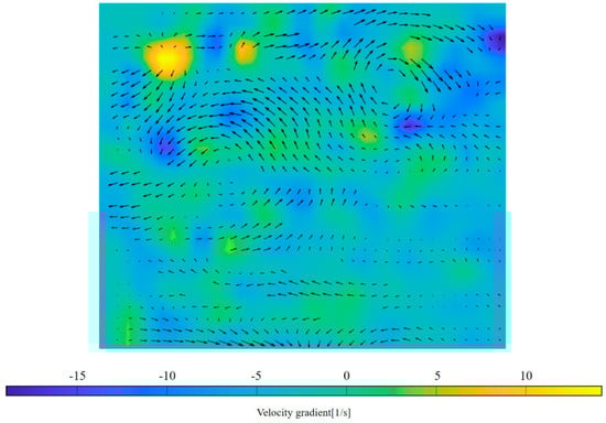 As shown in Figure 5, in order to investigate the driving effect of the high-frequency traveling magnetic field on the solutions at different locations in the container, we photographed the flow fields in the four regions from one to four within a short period of time, and, each time, the interval between the photographs was relatively short so that the effect of the temperature change due to Joule heat could be neglected. It can be seen that the average flow rate of the solution in the four regions is close, and the flow trend is consistent, as shown by the red trend line in the figure. They are all upward on both sides and downward in the center of the circulation, and the center part of the flow is stronger, but the regularity of the flow field in the local region is not obvious. Figure 6 shows the velocity gradient of region 2 when the maximum driving speed is reached, and it can be seen that the change in the flow velocity inside the whole fluid does not vary much, which also means that the high-frequency traveling magnetic field acts on the whole container, and there is no dead zone, which is significantly different from the mechanical stirring characteristics.