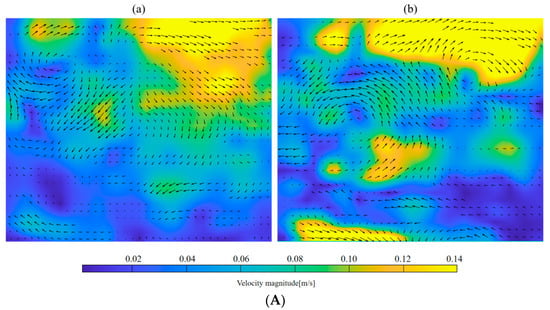 As shown in Figure 7, in Figure 7A, the driving phase current’s phase leads the induction phase current, resulting in an upward direction of the traveling-wave magnetic field and aligning the electromagnetic force with the direction of thermal convection. Conversely, in Figure 7B, where the driving phase current’s phase lags behind the induction phase current, the traveling-wave magnetic field moves downward, opposing the direction of thermal convection. It is evident that changing the direction of the traveling-wave magnetic field can significantly alter the flow direction of the liquid, while the maximum driving speed remains relatively constant. Therefore, by modifying the direction of the traveling-wave magnetic field, it is possible to achieve directional driving of low-conductivity liquids in various directions, leading to more optimal driving outcomes.