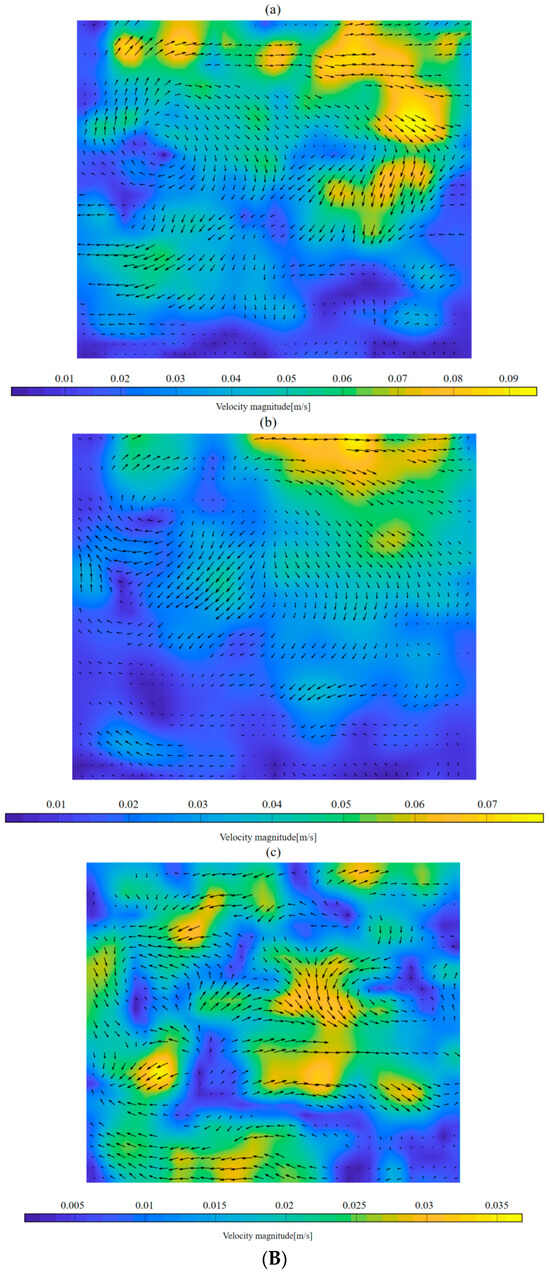 (A) Illustrates the driving effects of traveling-wave magnetic fields in different directions on low-conductivity liquids: (a) with the traveling-wave magnetic field oriented upwards, and (b) with the traveling-wave magnetic field oriented downwards (30% H2SO4). (B) Velocity vectors and intensity distributions of the flow field when driving different liquids: (a) NaOH (20%), (b) NaCl (saturated), and (c) [Bmim]BF4 (2.5 mol/L).