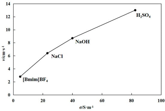 Figure 8 displays the flow field distribution of three other low-conductivity solutions used in this experiment, captured at room temperature when the maximum driving effect was achieved after starting the high-frequency power supply (t = 200 s). The maximum flow speeds calculated for the H2SO4 solution, the NaOH solution, the NaCl solution, and the [Bmim]BF4 ionic liquid solution in this region were 13, 9, 6, and 3 cm/s, respectively. Comparing the flow fields of solutions with different conductivities, it is observed that all four liquids exhibit a similar flow pattern, with higher conductivity fluids demonstrating more pronounced driving effects. This is attributed to the electromagnetic driving force being directly correlated with the liquid’s conductivity. Furthermore, the densities and viscosities of these solutions are relatively similar. A higher conductivity results in a greater electromagnetic force and more significant Joule heating during the driving process, leading to more pronounced thermal convection and increased driving speeds. Consequently, a direct positive relationship exists between the driving speed and conductivity, as exemplified in Figure 9. Remarkably, even for ionic liquid solutions with a conductivity as low as 4.7 S/m, an average directional driving effect of 2 cm/s can be achieved. To accommodate liquids with varying conductivities, adjustments such as modifying the spacing between coils or altering the capacitor and resistor configurations of the system can be made to enhance the output power of the high-frequency power supply, thereby augmenting the driving effect. The advantage of the high-frequency traveling-wave magnetic field is its uniform distribution throughout the entire container, ensuring that each portion of the solution experiences a propelling force. This presents a clear advantage over the mechanical stirring methods currently utilized in industrial applications involving ionic liquids.