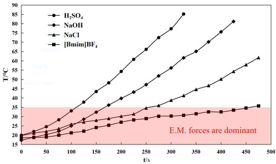 While driving low-conductivity liquids, the application of a high-frequency traveling-wave magnetic field also induces a substantial thermal effect within the liquid. When the high-frequency power supply provides power to the liquid, a portion of electrical energy is converted into kinetic energy to propel the liquid, while another portion is transformed into Joule heat, gradually raising the temperature of the liquid. Figure 9 displays the temperature rise curves for the four different media measured using thermocouples, covering a period of 0–500 s at the optimal working point of the high-frequency traveling-wave magnetic field system (as specified in Table 2). The experiment was terminated when the temperature rise exceeded 80 °C. The results indicate that a higher conductivity of the driving liquid corresponds to a greater power output from the power source, resulting in more pronounced Joule heating and a faster temperature increase. As the liquid’s temperature rises, its conductivity increases, causing changes in the load impedance of the high-frequency power source and consequently enhancing its output power. This correlation is also evident in Figure 9, where the heating rate of the various media accelerates with temperature. At lower temperatures, the electromagnetic driving force primarily influences the liquid’s flow. However, as the driving time extends, the accumulated Joule heat gradually intensifies the thermal convection’s impact on the liquid’s flow, leading to irregular turbulent vortices. This is evident from the velocity vectors in Figure 7’s flow field, where, after the same duration of power supply activation, the H2SO4 solution reaches the highest temperature, demonstrating the most noticeable irregular motion caused by thermal convection. In many industrial processes, such as the acid leaching process in non-ferrous metallurgy, chemical synthesis, and the high-temperature stirring of ionic liquids in catalytic processes, there is a need to simultaneously stir and heat low-conductivity liquids. In such scenarios, high-frequency traveling-wave magnetic field driving is particularly suitable.