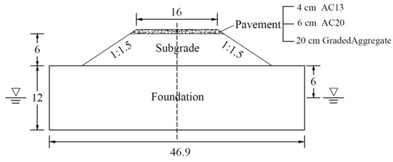 The typical highway structure applied in this study is shown in Figure 1, together with information on highway construction and hydrogeology in Africa. The pavement is composed of 4 cm AC13 + 6 cm AC20 + 20 cm graded aggregate with a width of 16 m. The slope of the subgrade was set to 1:1.5, with a height of 6 m. The foundation was assumed to be 12 m deep, with the initial water level being 6 m underground.