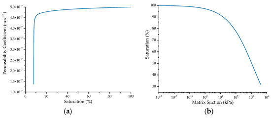 Hydraulic parameter curves of soil material: (a) relationship between permeability coefficient and saturation; (b) SWCC (Soil–Water Characteristic Curve).