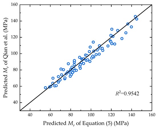 where the fitting parameters k1, k2, and k3 were determined using nonlinear regression analysis, and the source data came from the predicted resilient modulus of unsaturated clay in Nantong, Jiangsu Province, from Qian’s research [24]. As shown in Figure 4, the horizontal and vertical coordinates of the dots represent the results of the resilient modulus predicted using the two different models respectively. The fitting parameters were obtained as k1 = 0.4351, k2 = 0.9698, and k3 = −1.6522, and the goodness-of-fit value of the two models was 0.9542, with a significant correlation.