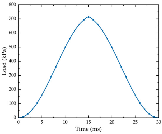 Generally speaking, the closer the soil is to the center of the load, the higher the load it is subjected to, and, accordingly, the greater its contribution to the equivalent resilient modulus. Thus, the weight function should reflect this characteristic. To this end, a falling weight deflectometer load was applied to the model to analyze the dynamic response. The FWD load was simplified as a circular homogeneous load with a half-period sinusoidal function with a peak load of 0.714 MPa, an action time of 30 ms, and a loading radius of 0.15 m, as shown in Figure 6. Considering the two-dimensional plane model used in this study, the circular homogeneous load was converted to a line load with a peak load of 168.23 kPa.