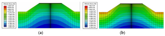 The vertical effective stress distribution of the initial state obtained from the analysis is shown in Figure 9a. Due to the existence of side slopes, the vertical effective stress shows a gradual increase from the surface of the side slopes inwards. As the water level rises and reaches stability, the vertical effective stresses in all parts of the structure are reduced significantly, as shown in Figure 9b, which is consistent with the results of the theoretical analysis.