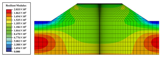 The distribution of the resilient modulus at a raised water level of 2 m is shown in Figure 10. In general, the resilient modulus gradually increases from the top of the subgrade and the slope to the depth of the foundation, which is consistent with the stress field distribution in Figure 7. From Equation (5), it can be gleaned that the contributions of bulk stress and shear stress to the resilient modulus are opposite, which means that the value of bulk stress is relatively large compared with that of shear stress and plays a dominant role in the magnitude of the resilient modulus. Meanwhile, the effect of matrix suction is reflected in the stress results through Bishop’s effective stress principle, and the foot of the slope has the smallest resilient modulus due to the small bulk stress and the presence of pore water pressure. At the top of the subgrade, the resilient modulus is larger than that at the foot of the slope; this is because the presence of matrix suction makes the effective stress here significantly higher.