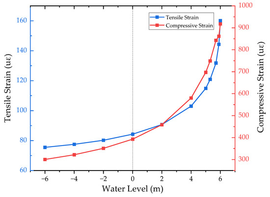 Curves of tensile and compressive strains versus water level.