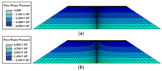 Specifically, the rapid increase in structural strain in the high-water-level case may be due to the influence of excess pore water pressure. The pore water pressure distributions corresponding to the peak loads at water levels of 0 m and 6 m, respectively, are given in Figure 12. Since the loading time was quite short, the FWD load was loaded to the peak value in only 0.015 s, and the permeability coefficient of the soil was quite small. Therefore, the excess pore water pressure accumulated within the subgrade could not be dissipated within such a short period of time, and the effective stresses were further narrowed down, leading to a decrease in the resilient modulus of the soil. However, when the water level of the subgrade was not high, the saturated zone of the soil was located at a deeper position, and only a small amount of excess pore water pressure was induced by the transfer of the pavement load to the saturated zone; additionally, the modulus of the soil at this depth contributes a small amount to the values of the strains, and thus the change in strain is not obvious.