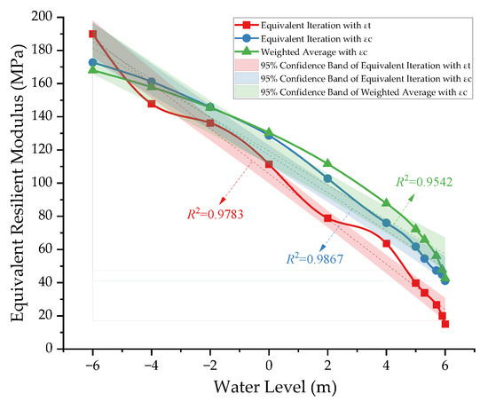 The two methods described in Section 2.3 were employed to calculate the equivalent resilient modulus of the subgrade, and the results are shown in Figure 13. Comparing the results of equivalent iteration by the two indicators of tensile strain εt and compressive strain εc, it can be seen that the modulus values of the two curves are different at the same water level due to the different indicators chosen, but the two show similar trends. The moduli of the subgrade all decrease significantly with the increase in water level. The variation range is 20~190 MPa, and the linear correlation coefficients are 0.9867 and 0.9783, respectively, which can essentially be regarded as corresponding to a linear variation.