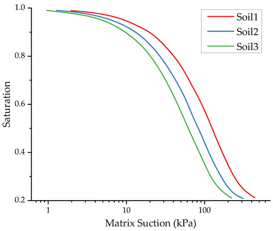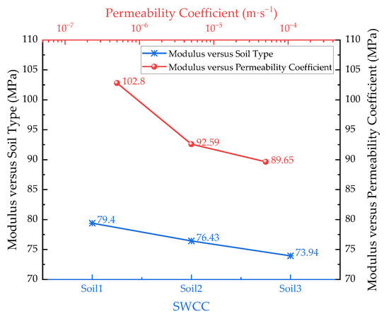 The SWCC of unsaturated soil determines the relationship between matrix suction and saturation, constituting an important parameter in the fluid–solid coupling analysis of unsaturated soil. Meanwhile, the saturated permeability coefficient of the subgrade directly affects the speed of moisture change inside the subgrade. Therefore, three SWCCs (Figure 14) and different saturated permeability coefficients of clay subgrade were selected to investigate the influence of the above two hydraulic parameters on the results of the equivalent modulus calculation.