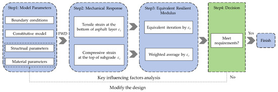 Based on the calculation method and analysis process proposed in this study, a preliminary framework for the design of a submerged subgrade was developed, as shown in Figure 17. The framework allows designers to quickly calculate the equivalent resilient modulus of a submerged subgrade, assess whether the overall stiffness of the subgrade meets the design requirements, and guide the optimization of the initial design based on the results of the analysis of the key influencing factors. Unlike the current resilient modulus prediction model for soil samples under specified conditions, this method considers the spatial inhomogeneous distribution of the modulus of the subgrade and calculates the equivalent resilient modulus of the subgrade as a whole by means of the finite element method, which is of strong engineering practicability, and the framework can generally be divided into four parts: