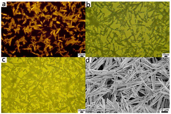 The concentration of the NaOH solution was a major factor affecting the growth rate, morphology, and size of the Bi2O3 crystals. While keeping other experimental parameters unchanged, we studied the effects of the morphology of Bi2O3 by changing the content of NaOH. Figure 2 shows POM and SEM images of the Bi2O3 microrods with different contents of NaOH while maintaining the volume of the NaOH solution at 70 mL and using a reaction time of 50 min. As Figure 2a shows, the Bi2O3 nanomaterials obtained were composed of Bi2O3 microrods at the NaOH content of 0.3 g. As the NaOH content was increased, the particle size of the Bi2O3 microrods increased (Figure 2b), and the scale uniformity of the Bi2O3 crystals decreased, while some of the crystals adhered to each other, as Figure 2c shows, which was consistent with the SEM images in Figure 2d. The SEM images (Figure 2d) clearly showed that the as-synthesized Bi2O3 had rod-like structures with a ratio of the length (~50 µm) to the diameter of about 10 (3–4 µm). In addition, as the reaction temperature increased, the rod-shaped Bi2O3 crystals became shorter, and the products consisted of microrods and irregular particles (see Supporting Information Figure S1).