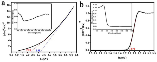 The optical band gap values of the Bi2O3 microrods were analyzed by using UV-vis DSR and UV-vis spectra based on the Kubelka–Munk method [67,68], as illustrated in Figure 3. Figure 3a shows that the variations in the band gap energy values of the Bi2O3 microrods were in the range of 2.25–3.18 eV. These results were supported by the UV–DRS spectrum analysis, as depicted in Figure 3b, where the band gap energy values of 2.79 eV obtained for the Bi2O3 microrods were consistent with the experimental findings [69,70,71]. The outcomes demonstrated that the as-prepared Bi2O3 microrods with a band gap of 2.79 eV were enough to activate photocatalysis under visible light.