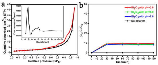 Figure 5 shows the N2 adsorption–desorption isotherms, aperture distribution curve, and RhB solution photodegradation curve of the Bi2O3 microrods (see Figure 2d) at different pH values in a dark room. Figure 5a shows that the Bi2O3 microrods are a mesoporous material with a type IV and H 3 hysteresis loop [72]. BET analysis revealed that the BET surface area, pore volume, and average pore size of the Bi2O3 microrods were 4.7846 m2/g, 0.012 cm3/g, and 10.032 nm, respectively. These results confirmed that the large surface area and pore volume of the Bi2O3 microrods could expose more active sites, which was beneficial for the subsequent adsorption and photocatalysis of RhB. Figure 5b shows the blank experimental results of RhB degradation when catalyzed at different pH values in a dark room. As shown in Figure 5b, in the absence of a catalyst, the degradation of RhB could be ignored in the presence of darkness for 120 min. The curves plotted in the presence of the Bi2O3 microrod catalysts at the pH values of 3.0, 5.0, and 7.0 showed only 9.4%, 8.6%, and 8.1% decolorization after 120 min in the dark, respectively, confirming that the decolorization of RhB solutions was dominated by surface adsorption.