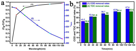 (a) (1) Degradation efficiencies and (a) (2) λmax shifts; (b) efficiency of the removal of COD and TOC from RhB solutions with Bi2O3 microrods as photocatalysts in a typical photocatalytic experiment at a pH of 3.0.