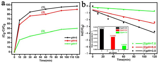 The concentration of H+ ions in the solution is another key factor for the photodegradation of RhB dyes. Plots of the pH dependence of RhB degradation with different irradiation times are depicted in Figure 7. It can be seen in Figure 7a that the Bi2O3 microrod sample showed different photodegradation activity at different pH values. Within 120 min of irradiation, the degradation percentage of RhB in the environments of the pH value of 3.0, pH value of 5.0, and pH value of 7.0 was 97.2%, 90.6% and 50.2%, respectively. Figure 7b shows that the rate constant values (min−1) were 0.02761, 0.01698, and 0.00504 at the pH values of 3.0, 5.0, and 7.0 respectively. The rate constant values exhibited a maximum at the pH value of 3.0, as seen in the lower inset of Figure 7b. Greater RhB degradation at a lower pH value could be seen in this result, and this was attributed to the increased formation and accumulation of H2O2 and •OH radicals at acidic pH levels [66,75], which led to an increase in the degradation rate of RhB, resulting in a higher degradation rate higher H+ concentration than those at neutral levels (pH = 7.0). The results of the pH dependence experiments showed that the as-prepared Bi2O3 microrods exhibited good photocatalytic performance for RhB removal at a higher H+ concentration.