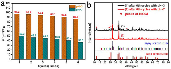 (a) Cycling experiments and (b) XRD images of the Bi2O3 microrods after the sixth cycle of degradation of RhB with pH values of 3.0 and 7.0.
