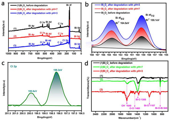 The elements and chemical components of pre- and post-photocatalytic degradation Bi2O3 microrods at different pH values were analyzed using XPS and FTIR determination, and the results are displayed in Figure 9. The elements of C, Bi, and O can be observed in full-scan spectrum shown in Figure 9a, which indicates that these three elements coexisted in Bi2O3 before and after degradation. The presence of C may have been introduced into the environment during sample preparation [76,77]. A new element, Cl, was observed in the Bi2O3 after photodegradation at a pH value of 3.0, as shown in Figure 9a(3). High-resolution XPS (HR-XPS) analysis of Bi4f in the pre- and post-photocatalytic degradation Bi2O3 samples (Figure 9b) showed that two feature peaks of the binding energies of 159.1 and 164.5 eV corresponded to Bi 4f7/2 and Bi 4f5/2 of the trivalent bismuth ion (Bi3+), respectively [78,79]. Figure 9c displays the HR-XPS analysis of the post-degradation Bi2O3 microrods, from which we can see that the two highest-intensity peaks located at around 199.8 and 198.2 eV corresponded to Cl 2p1/2 and Cl 2p3/2 in the region of Cl 2p, respectively, which demonstrated that BiOCl was easily produced on the surface of Bi2O3 after degradation in the acidic environment [80].
