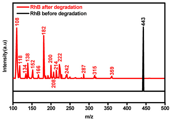 To reveal the degradation pathway and mechanism of RhB with the Bi2O3 photocatalyst, the intermediates were determined by using LC-MS, as depicted in Figure 10. According to Figure 10, some pre- and post-degradation products were found in LC-MS, and they had strong signs at m/z 443, 359, 315, 287, 242, 222, 214, 208, 200, 182, 166, 152, 138, 134, 118, and 108.