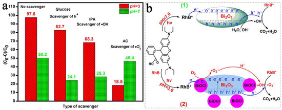 (a) Degradation profiles of RhB with Bi2O3 microrods without a scavenger and with glucose, IPA, and AC as scavengers of h+, •OH, and •O−2. (b) Degradation mechanism of Bi2O3 microrods at pH values of (1) 7.0 and (2) 3.0.