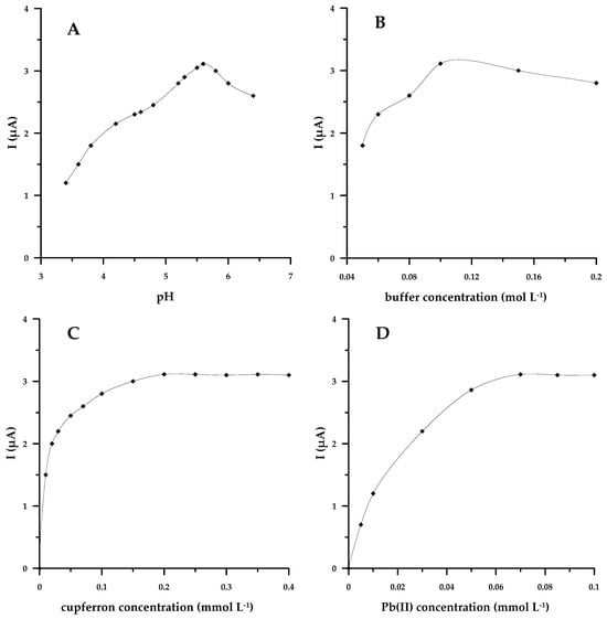 The dependence of the Ga(III) peak current on solution pH (A), buffer (B), cupferron (C), and Pb(II) (D) concentration. Concentration of Ga(III) equal to 7 × 10−8 mol L−1.
