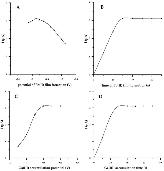 The dependence of the Ga(III) peak current on potential of Pb(II) film formation (A), time of Pb(II) film formation (B), Ga(III) accumulation potential (C) and Ga(III) accumulation time (D). Concentration of Ga(III) equal to 7 × 10−8 mol L−1.