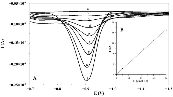 (A) The adsorptive stripping voltammograms recorded after preconcentration in different Ga(III) concentrations: (a) 0.0; (b) 0.003 µmol L−1; (c) 0.02 µmol L−1; (d) 0.05 µmol L−1; (e) 0.085 µmol L−1; (f) 0.15 µmol L−1; (g) 0.22 µmol L−1; (h) 0.3 µmol L−1; (i) 0.4 µmol L−1. (B) The plot of the peak current in stripping voltammetry versus the Ga(III) concentration.