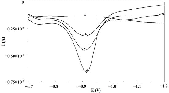 The AdSV voltammogram responses obtained during the gallium analysis in the certified reference material SPS-SW2 Surface Water: (a) SPS-SW2 diluted ten-fold; (b) as (a) + 0.045 µmol L−1 Ga(III); (c) as (a) + 0.065 µmol L−1 Ga(III); (d) as (a) + 0.110 µmol L−1 Ga(III).