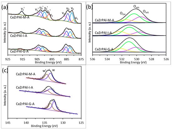 The microstructural properties of a material play a crucial role in determining its performance. Therefore, we investigated the properties of the material from a microscopic perspective. Figure 2a–c show the Ce 3d, O 1s, and P 2p XPS spectra of CeZrPAl composite oxides prepared using different methods after aging at 1000 °C, respectively. Table 1 summarizes the XPS data of aged CeZrPAl composite oxides prepared using different methods. From Figure 2a, it can be observed that the Ce 3d XPS spectrum contains ten characteristic peaks, where v0, v1, v2, v0′, v1′, and v2′ correspond to the characteristic peaks of Ce4+ 3d5/2, and u0, u1, u0′, and u1′ correspond to the characteristic peaks of Ce3+ 3d5/2 [,]. In Figure 2b, it can be seen that the O 1s XPS spectrum contains three characteristic peaks, where Olatt corresponds to the lattice oxygen on the surface, Oads corresponds to the adsorbed oxygen species (e.g., O2−, O2−2, O−), and OOH corresponds to the adsorbed water on the surface [,]. In Figure 2c, the P 2p peak contains two characteristic peaks, P 2p1/2 and P 2p3/2. The separation of binding energies between the two peaks is approximately 1.0 eV, consistent with that reported in []. Compared to the mechanical mixing method, it can be seen that the Ce 3d, O 1s, and P 2p spectra of CeZrPAl samples prepared using the sol–gel and impregnation methods exhibit significant shifts towards higher binding energies in Figure 2a–c. The results indicate that the electron-donating ability of P in the supports is stronger in the CeZrPAl samples prepared using the sol–gel and impregnation methods, which increases the covalent component of metal–oxygen and, thus, achieves a decreased Fermi level and acidity [,].